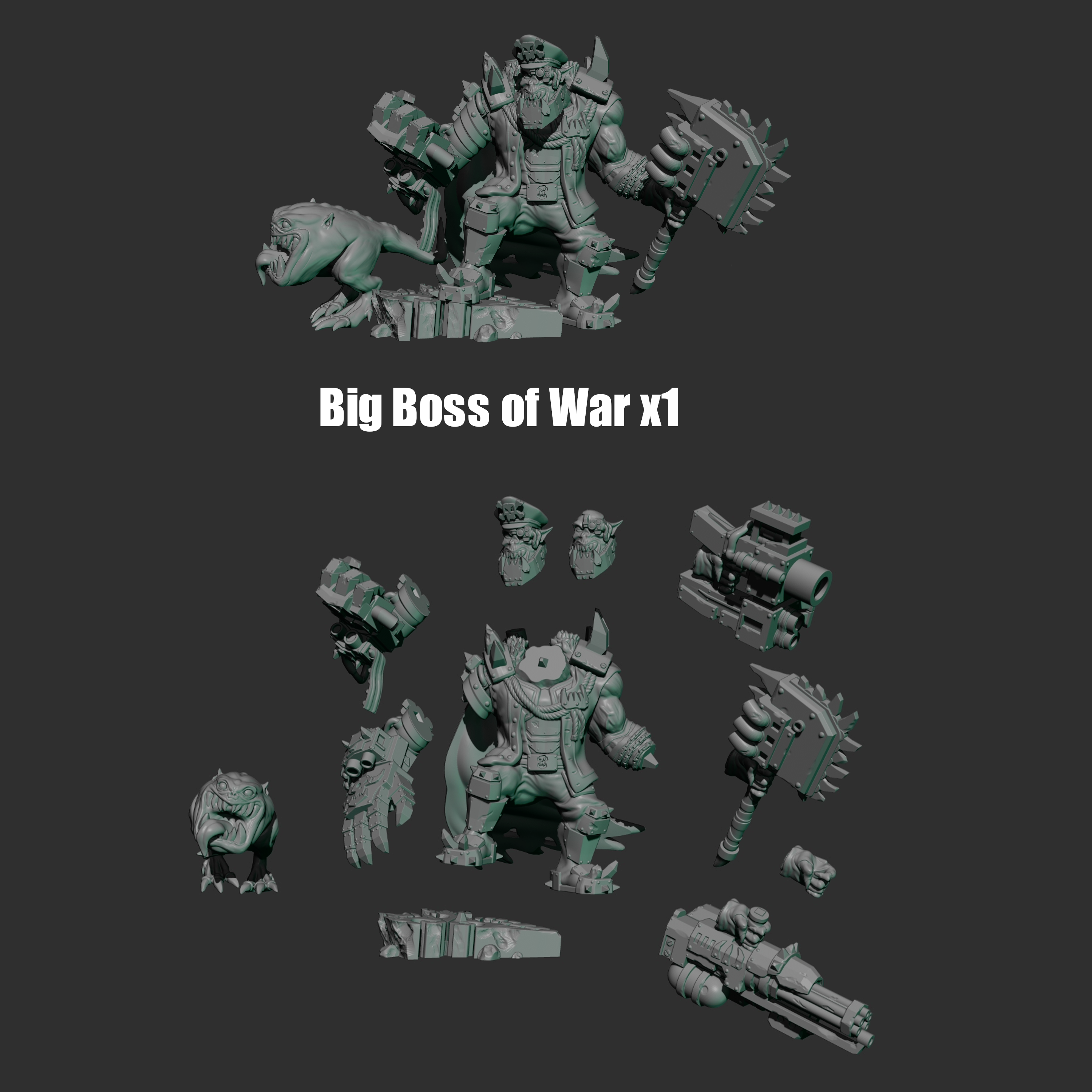 Included are 1 unique sculpt of an Orc Big Boss of War (multi-part, multiple head, arm and weapon options) as well as 1 Squaggle.