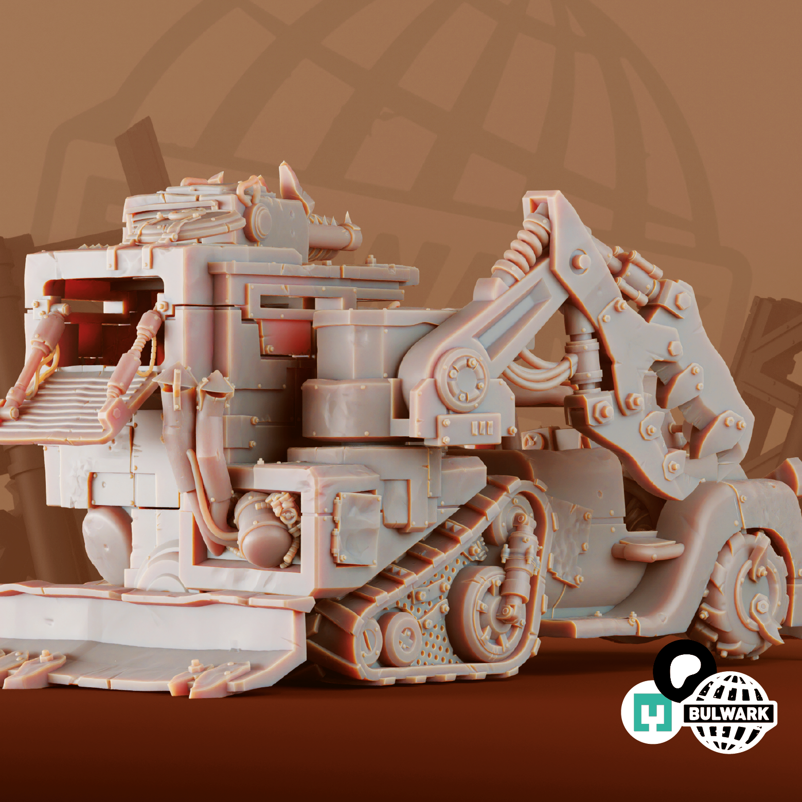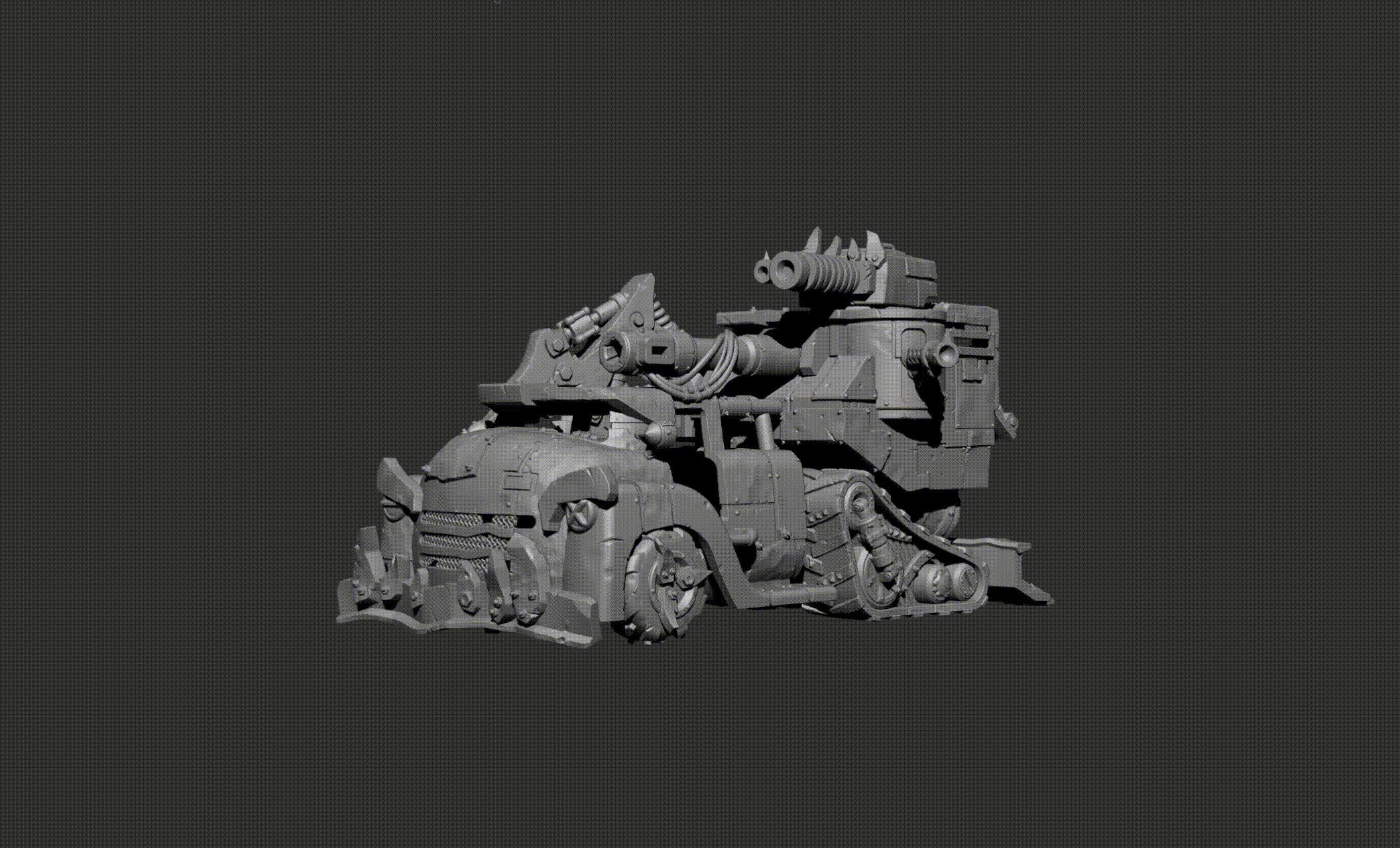 Built like an old 50s cab, but bigger, meaner, and covered in riveted scrap, it’s got a slab-front grille that looks like it wants to bite. The engines? A mess of smokin’, belchin’ mek-magic—half jet, half diesel, all loud. Tracks on the back for grindin’ over gitz, big fat tires up front for crunchin’ anything too stupid to get outta the way.