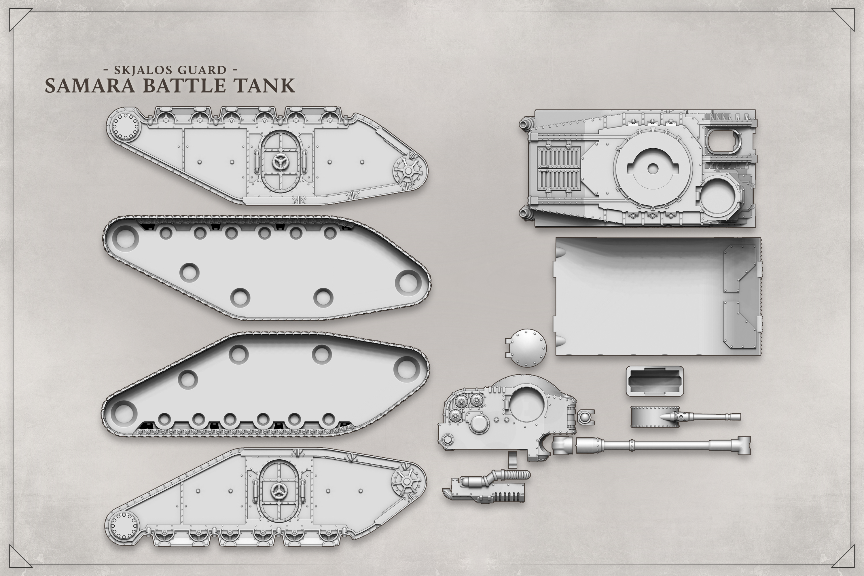 Ancient vehicles hailing from a time of expansion and progress, the Samara tanks were designed during the distant age of the Skjalos Guard - an age of mighty generals, conquering the world and building an empire.