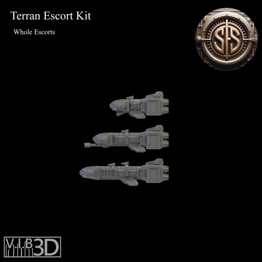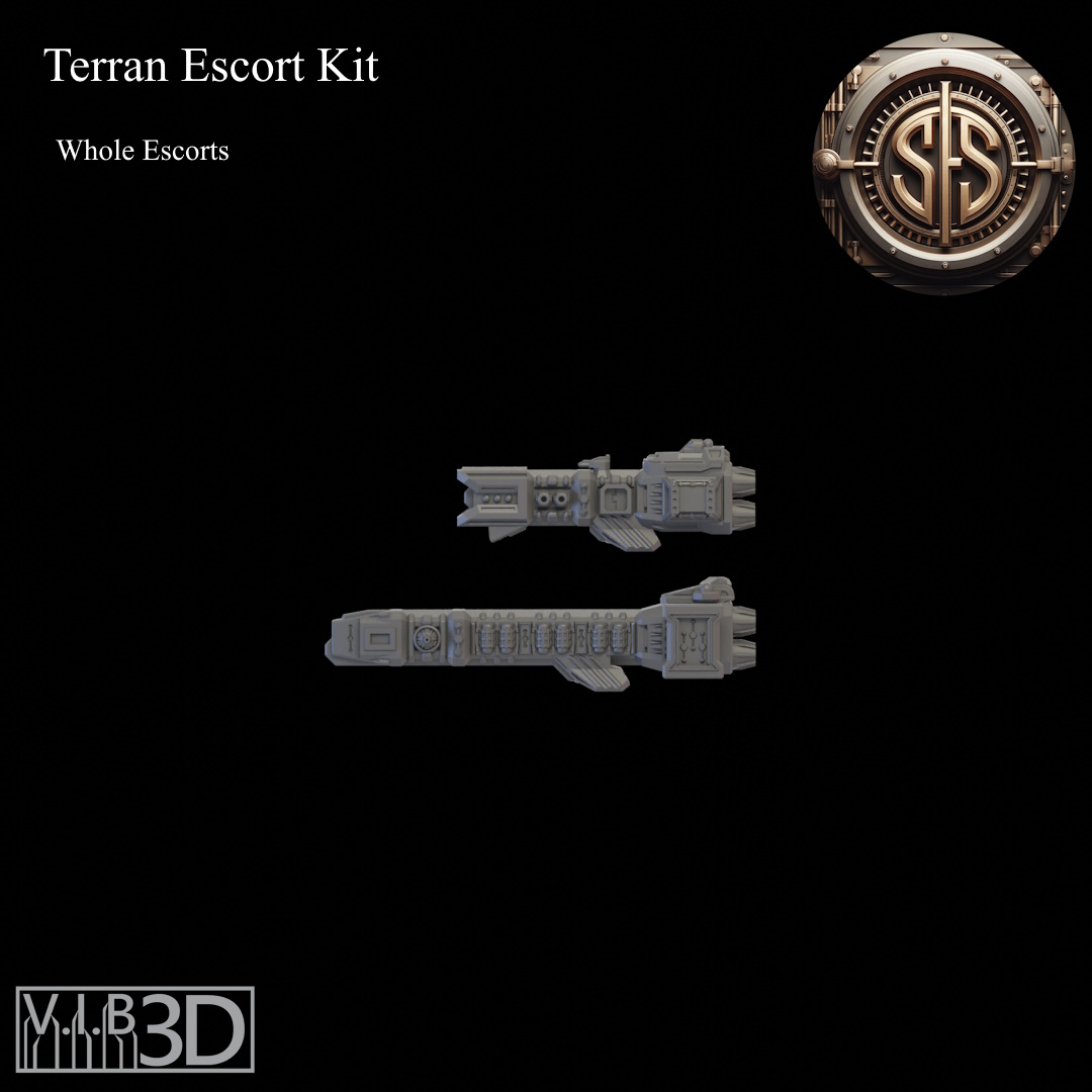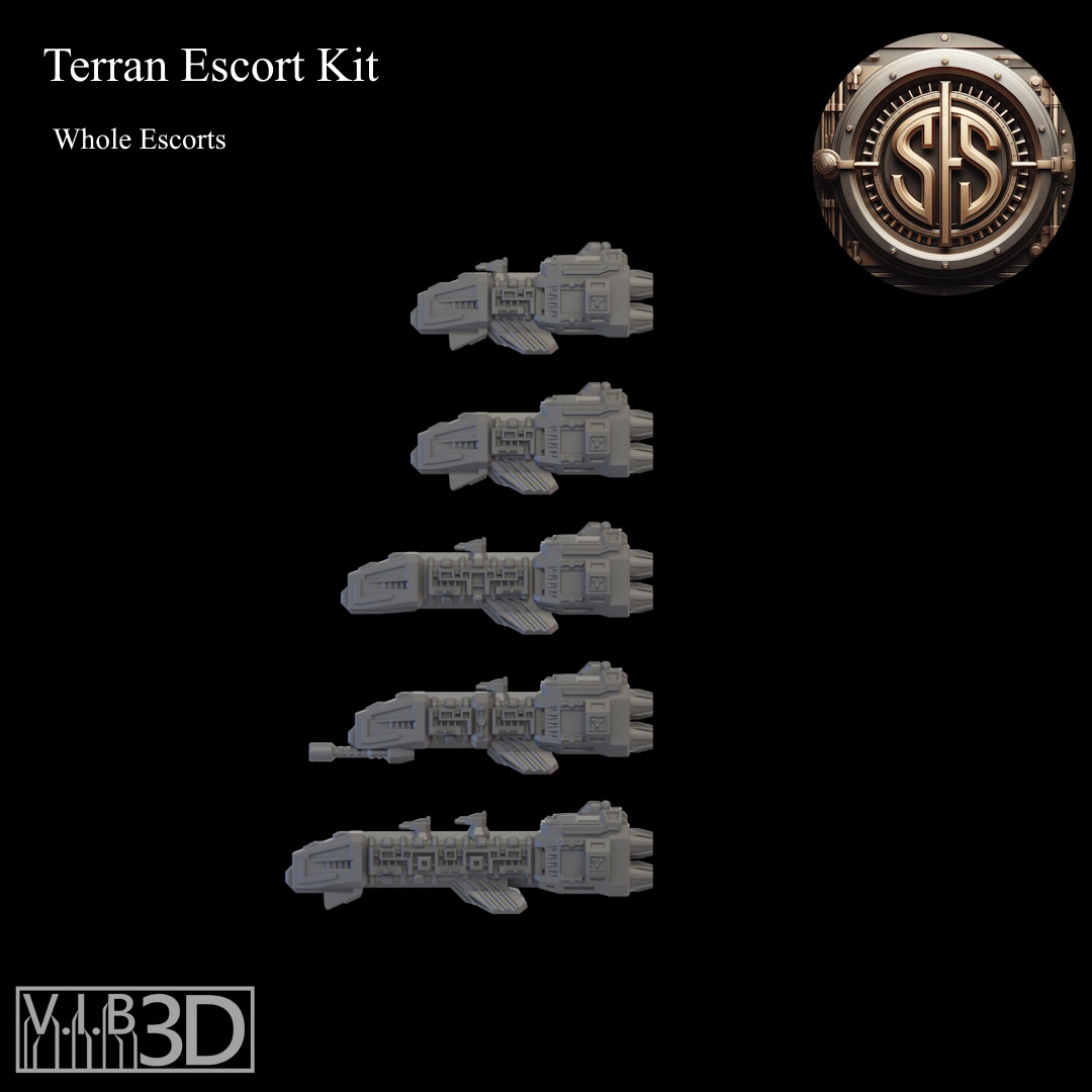 The Terran fleet is made up of a number of vessels with the Escort Class being the most numerous. With the many needs of the Terran Empire there are many configurations for these small craft. From teeny tiny little system ships to destroyers just shy of light cruiser size. This kit will allow you to build a vast array of different escort ships for your space games. These are scaled to fight some of the most popular fleets, but also work well as ships for other fun games where thrusting at billions of stars might happen, or maybe in a game full of warfleets.... There is also an adapter piece that will allow some intermixing with the Terran Cruiser kit. See the readme for details.