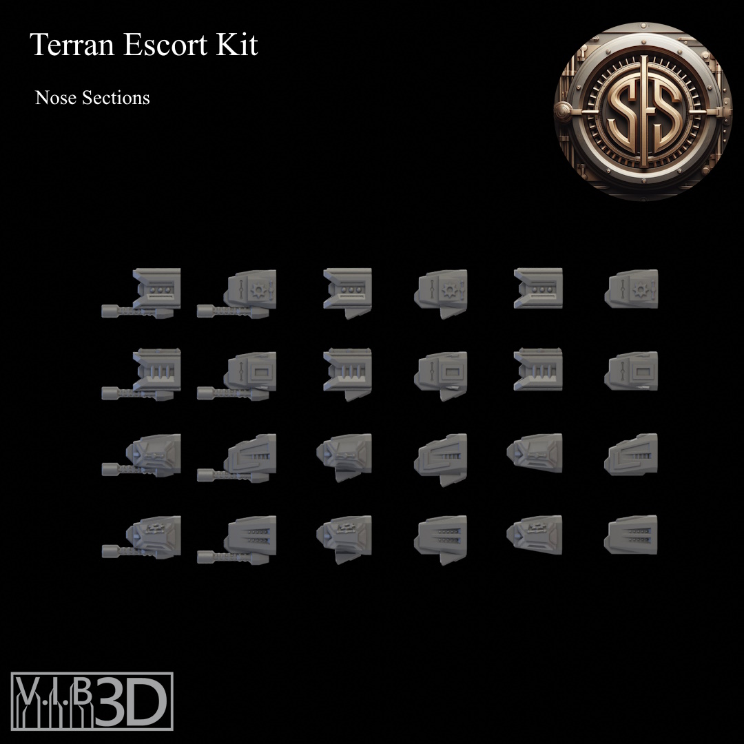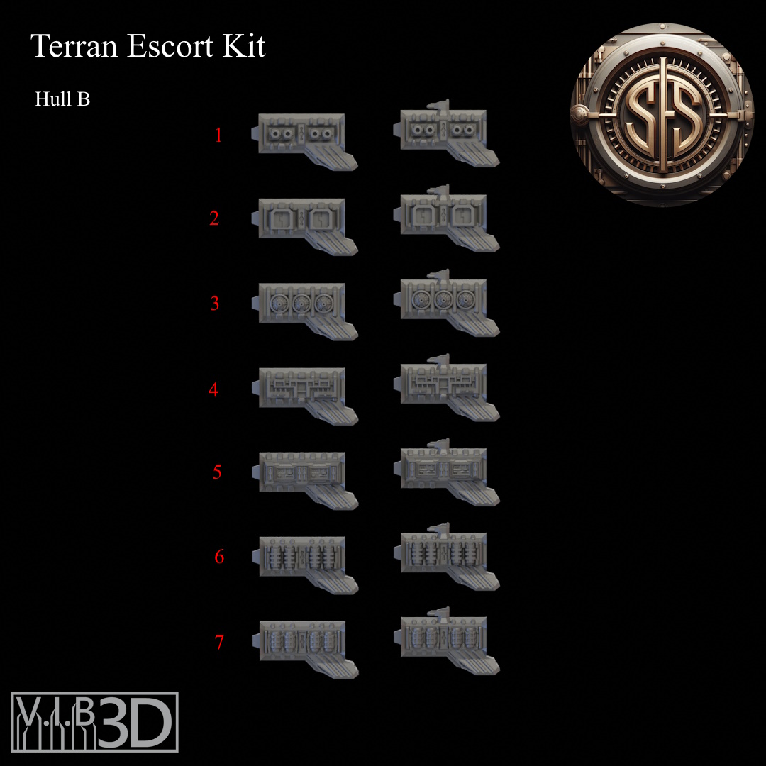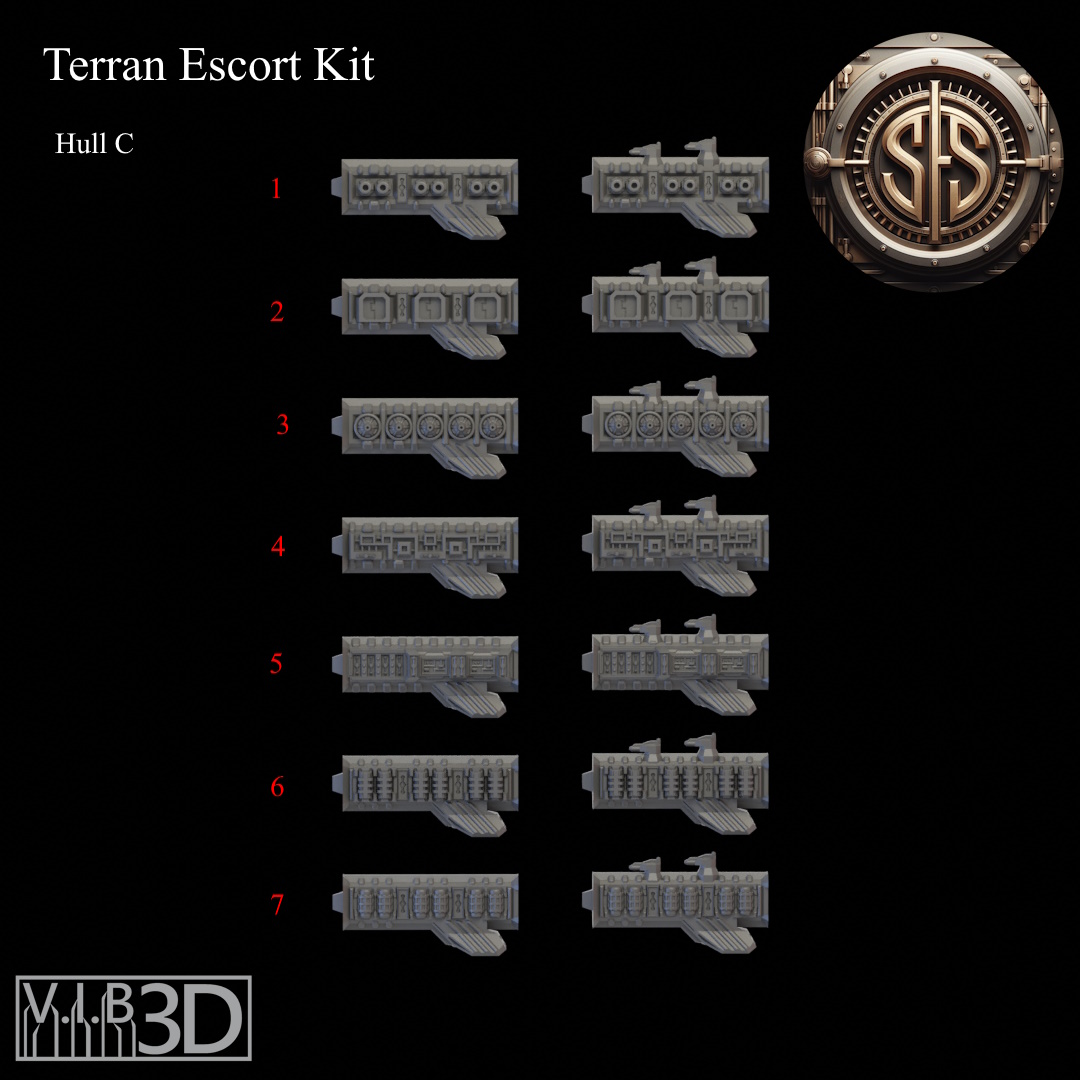 The Terran fleet is made up of a number of vessels with the Escort Class being the most numerous. With the many needs of the Terran Empire there are many configurations for these small craft. From teeny tiny little system ships to destroyers just shy of light cruiser size. This kit will allow you to build a vast array of different escort ships for your space games. These are scaled to fight some of the most popular fleets, but also work well as ships for other fun games where thrusting at billions of stars might happen, or maybe in a game full of warfleets.... There is also an adapter piece that will allow some intermixing with the Terran Cruiser kit. See the readme for details.